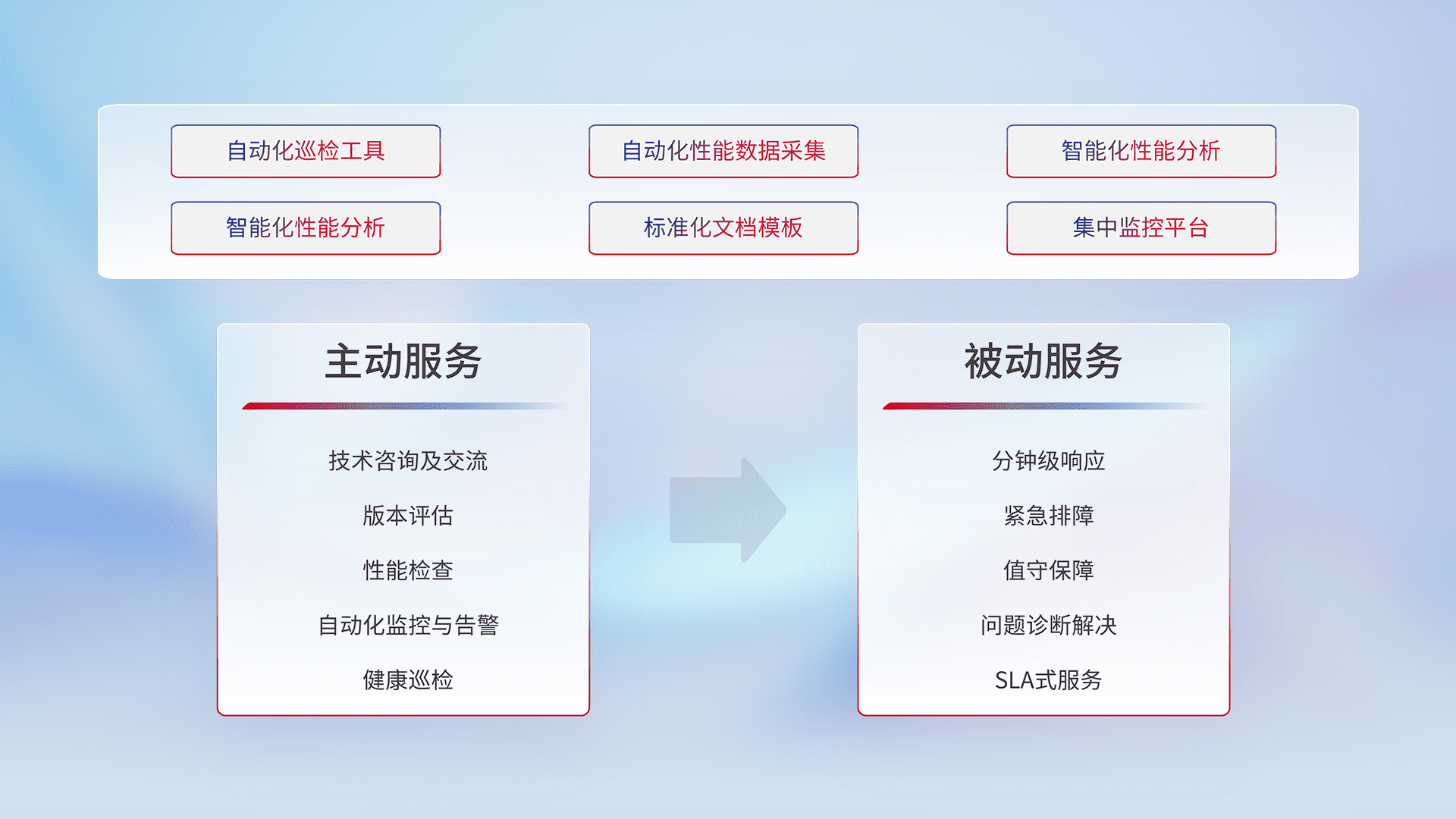 智能化工具和标准化文档,,,,保障服务质量,,提供主动服务(包含技术咨询、、、版本评估、、、性能检查、、、、自动化监控与告警、、、健康巡检)和被动服务包含(分钟级响应、、、、紧急排障、、、值守保障、、、问题诊断解决、、SLA服务)。。。。
